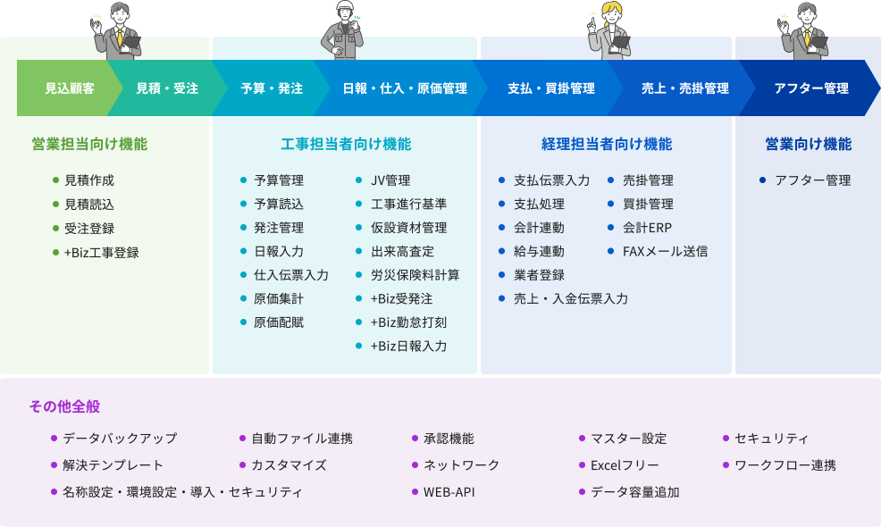 二度手間が発生しがちな全社の業務をトータルにサポートし、受注前から引渡し後までの業務の効率化と情報の一元化による早期チェック体制の両立を実現します。