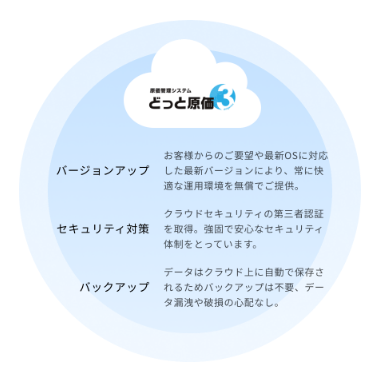 どっと原価3はSaas型のサービスのため、お客様でデータ保全やセキュリティ対策を行う必要はありません。