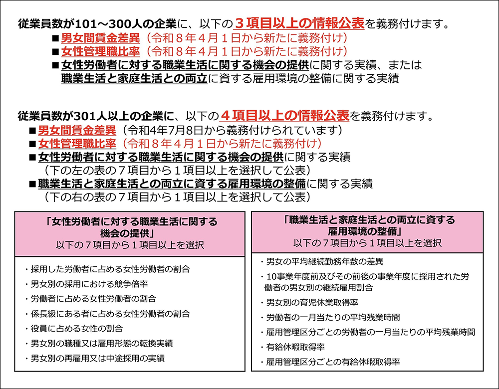 | 101人~300人 | 1項目以上を公表 | 男女間賃金差異及び女性管理職比率に加えて、1項目以上を公表 |