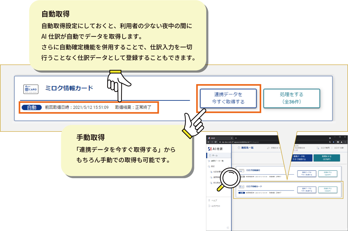 AI仕訳には、登録された連携先のデータを自動で取得する機能が搭載されています。
