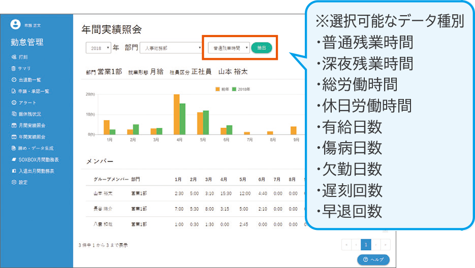 - 社員ごとの月間実績や、年間の残業・有給取得状況を一覧で確認。