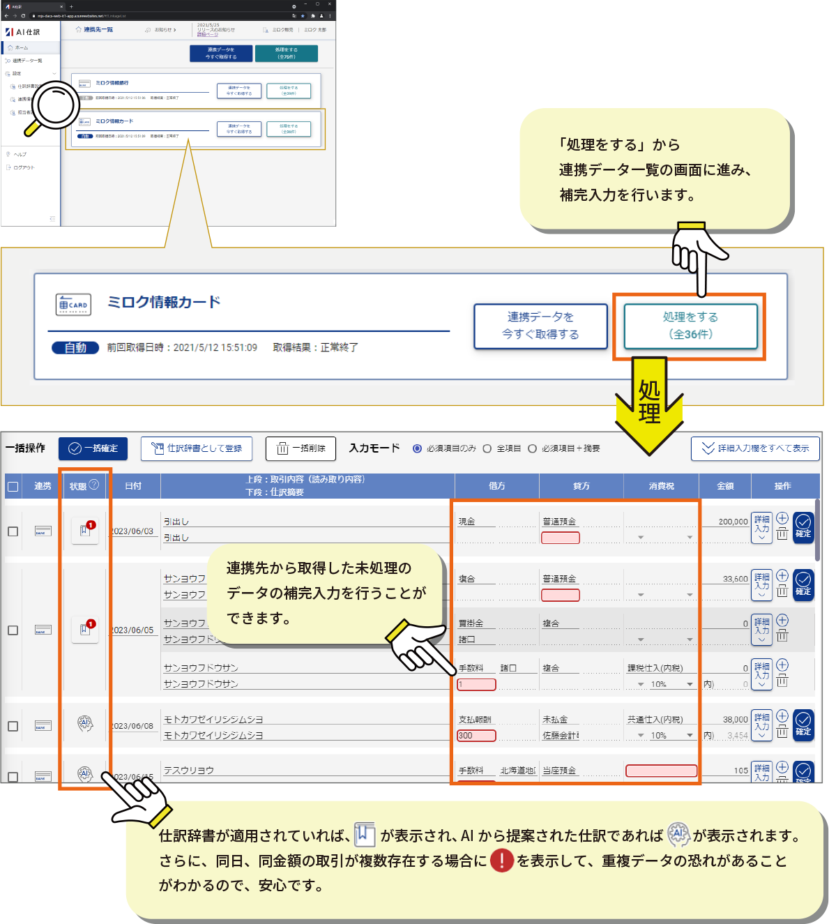 一方、「AIによる仕訳の提案」は、仕訳辞書が適用されなかった連携データに対してのみ動作します。仕訳辞書とは異なり、自動確定はせず、必ずお客様が確認して仕訳として確定をしていただく必要があります。